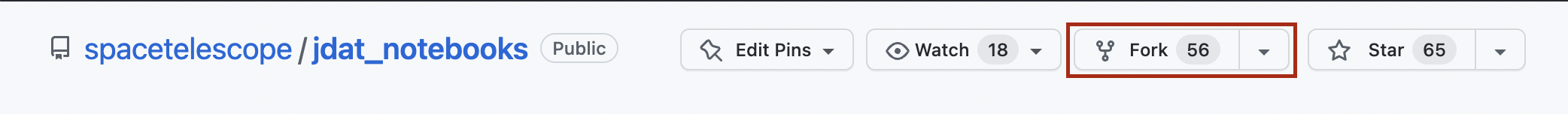 第一步是创建 STScI jdat_notebooks 仓库的 GitHub 副本。 您在 GitHub 账户上的复制仓库称为“分叉”。要创建分叉,请点击 STScI 的 jdat_notebooks 仓库右上角的 ``fork`` 按钮。会弹出一个对话框,您可以选择您的 GitHub 账户来创建分叉。