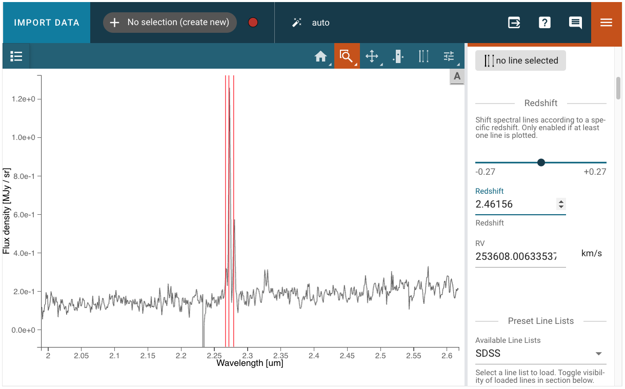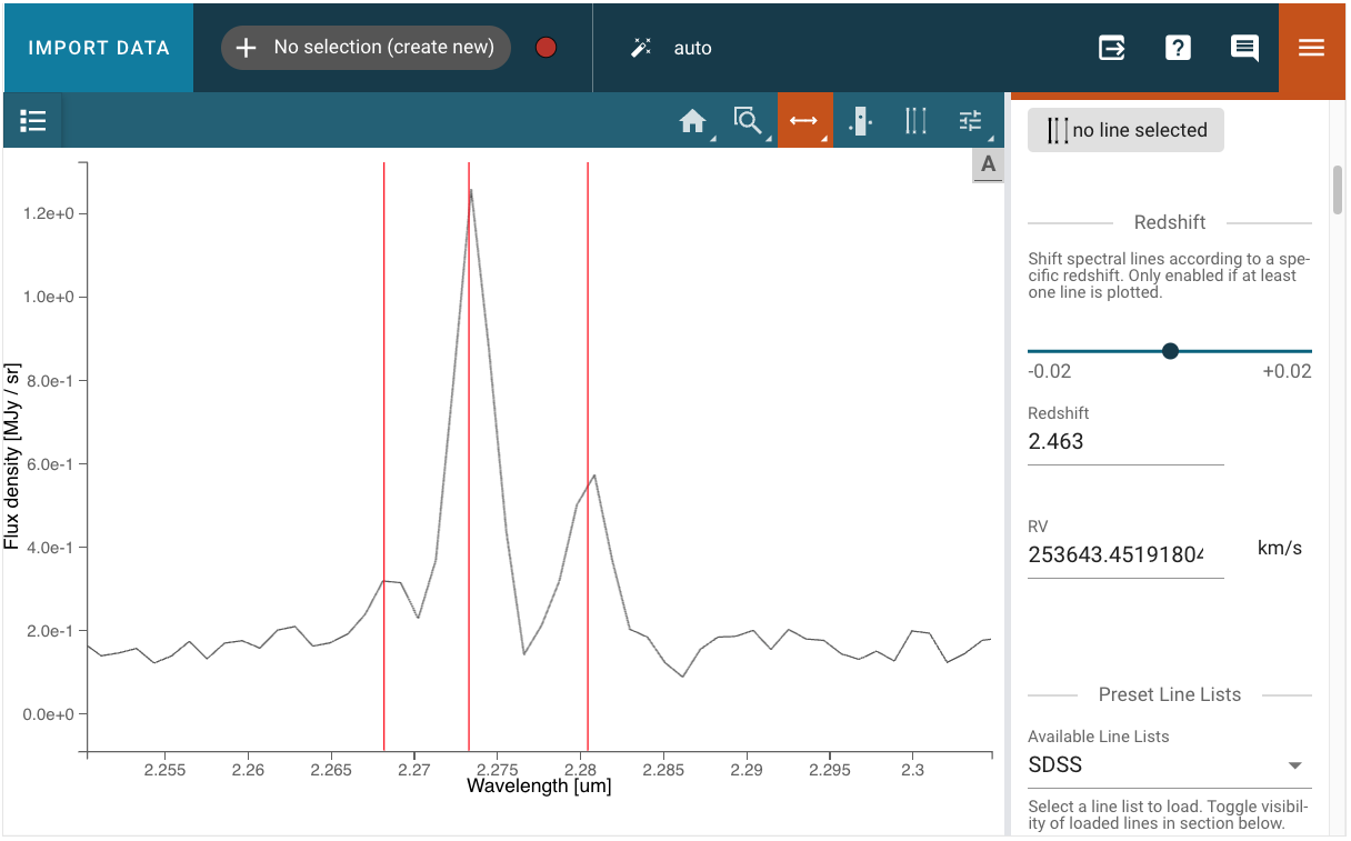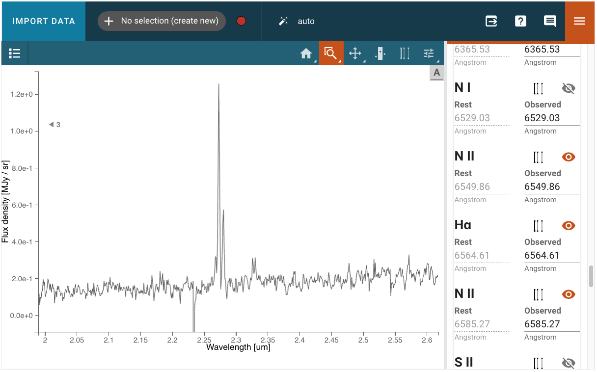 Specviz将允许您将谱线波长与您在光谱中看到的发射线进行匹配。您可以使用红移滑块在线列表插件中完成此操作。但首先,让我们在Specviz中打开光谱。
